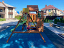 Игровая площадка изготовлена из клееного соснового бруса и массива сосны .Дерево обработано безопасной декоративно-защитной пропиткой. Технология значительно увеличивает срок службы конструкций, повышает прочность древесины, защищает её от гниения и грибков.